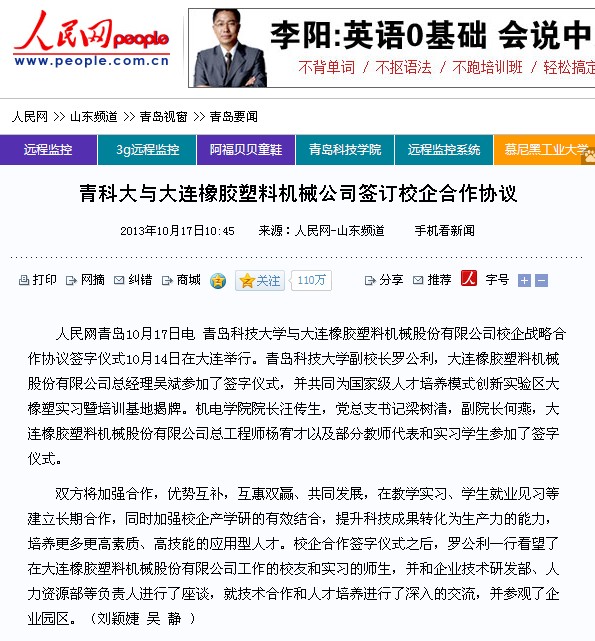 11月14日,色情小说 与大连橡胶塑料机械股份有限公司校企战略合作协议签字仪式在大连举行。