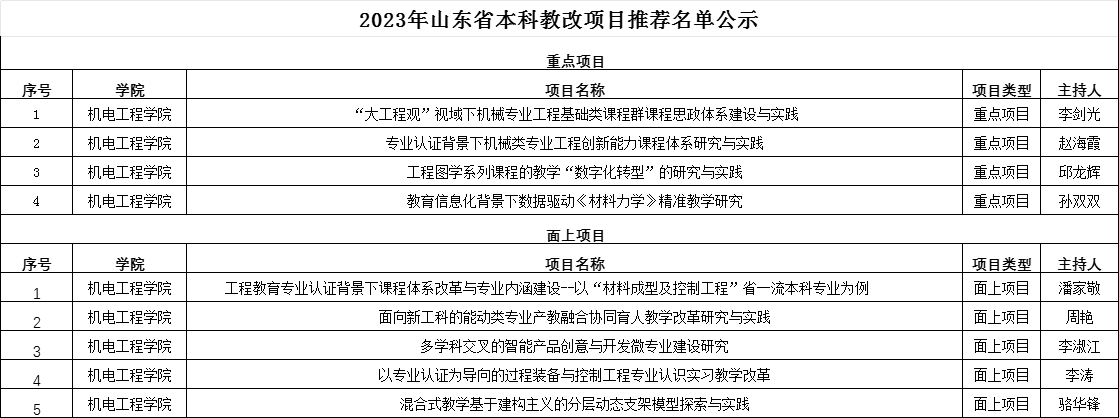 根据学校《关于组织开展2023年山东省本科教学改革研究项目立项申报和管理工作的通知》要求,色情小说 组织开展了省级教改项目申报工作,经项目负责人个人申报,校内专家评审,共拟推荐重点项目4项,面上项目5项,至学校,进行下一步评审。现将结果公示如下: