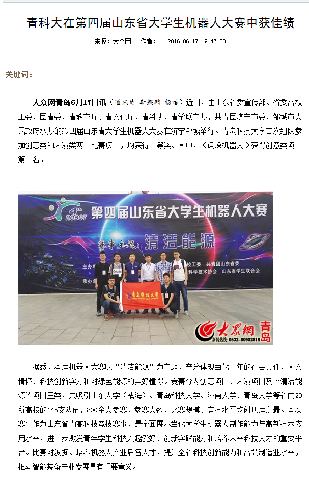 【大众网】【科学网】青科大在第四届山东省大学生机器人大赛中获佳绩