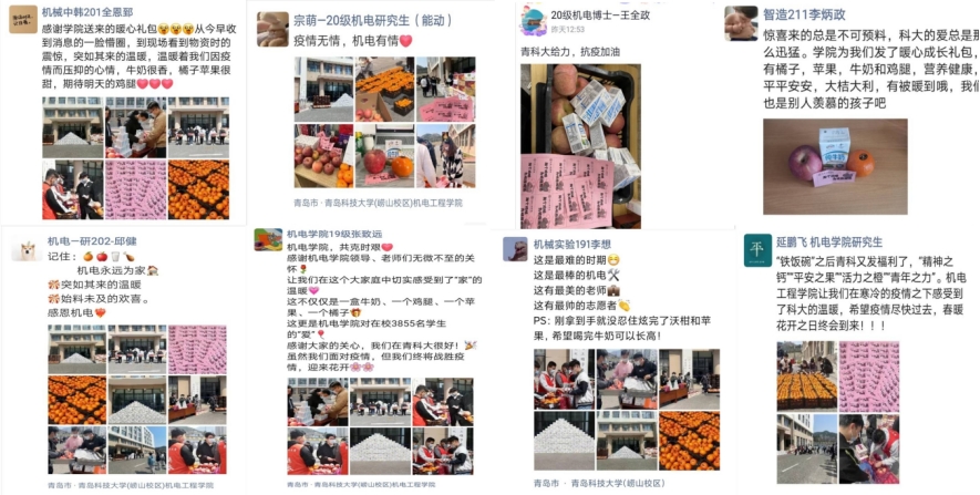 “机电永远的家!”“疫情无情,机电有情”“大爱机电!真的太贴心了!”“青科大yyds!机电yyds!”“我们就是传说中的‘别人家的大学’!”“学校和学院总会送来惊喜”“我们在这里感受到了‘家’的温暖”“前有铁饭碗,后有暖心包,没错,我们就是别人家的学校学生”“超爱青科,超爱机电”“感恩有你,让我们一起静待花开!”“学院的惊喜总是猝不及防,刚听闻要发放暖心成长礼包,没想到马上就收到了”,收到这份别样的“暖心礼”后,师生们纷纷晒出了自己对学院的感谢和对战“疫”的信心。温暖的牛奶、香甜的水果、美味的鸡腿,温暖着师生的心、洋溢着浓浓的情,一时间,这份暖心刷爆朋友圈,成为科大校园里的“网红”。色情小说