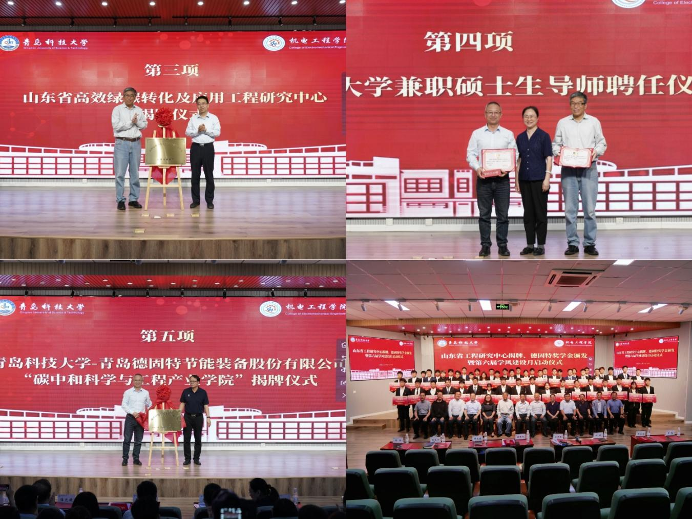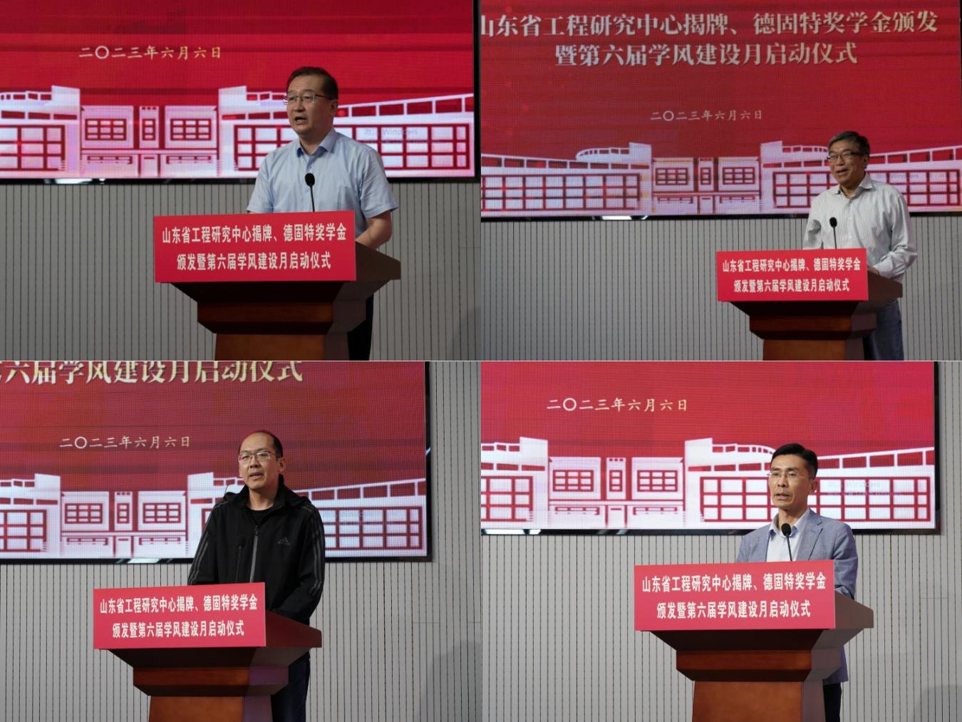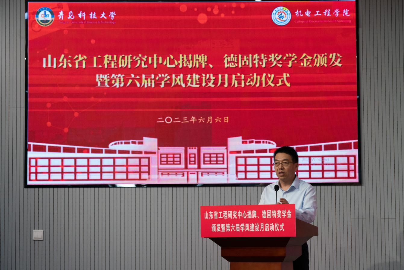 在D3楼530举办山东省工程研究中心揭牌、碳中和产业学院揭牌、德固特奖学金颁发暨第六届学风建设月启动仪式。学校党委常委、副校长吕万翔出席仪式并讲话,学生处、校团委、教务处相关负责人,青岛德固特节能装备股份有限公司董事长魏振文,副总经理崔建波,学院领导班子及师生代表参加会议。会议由学院党委副书记兼副院长肖强主持。