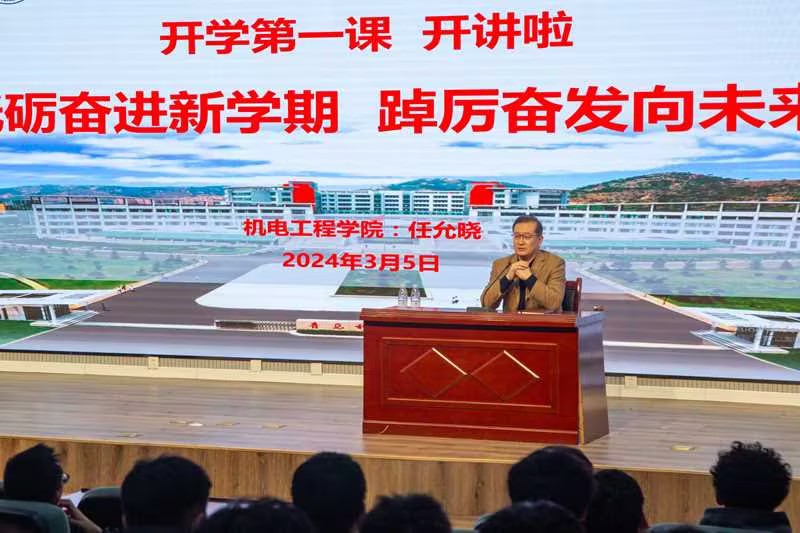 任允晓首先与同学们交流了刚刚过去的寒假生活,了解同学们寒假见闻,并指出春雷响,万物长,一年之计在于春。新学期伊始,同学们如何度过大学四年学习生活,任允晓以“学习、观察、思考、判断、行动”为关键词,运用“为什么、是什么、怎么做”的逻辑思维展开,为与会师生带来一场生动深刻、别开生面的开学第一课。任允晓结合全国两会的召开,为同学们解读了国内外形势和社会科技的发展动态,旁征博引,讲明了确立个人目标的重要性,阐述了做好个人职业规划和付诸实际行动的关系,引导机电学子努力成长为一专多能的高素质复合型人才,在今后的学习工作生活中,真正做到“身心光明、万物生长”。