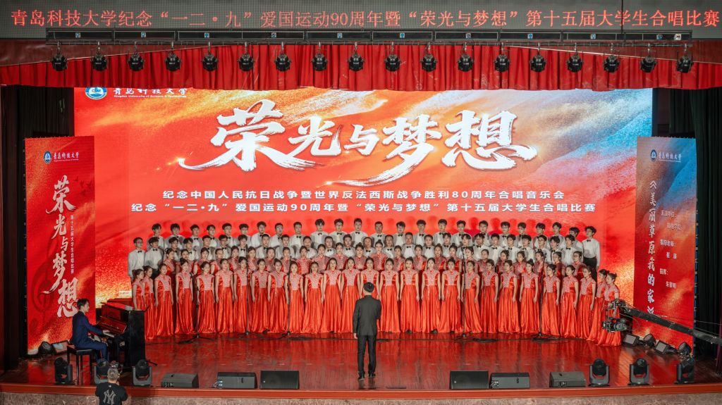 自10月中旬成员选拔至12月9日决赛登台,合唱团累计开展集训30余次,训练总时长超100小时。在近两个月的备战过程中,全体成员团结一心、全力以赴。指导老师悉心指导,对演唱技巧、声部配合与舞台表现精雕细琢;学院领导、团干部率先垂范,积极参与排练,与青年学子共同练唱、共悟历史;队员们妥善协调学业,认真投入训练,在声部磨合、音准调整与情感表达中不断锤炼,深刻体会歌曲所承载的历史记忆与精神内涵;学生会骨干坚守在服务保障一线,为合唱团顺利备赛、精彩呈现提供了基本保障。决赛现场,学院党委副书记、团委书记、专职团干部与同学们默契配合,以纯净和谐的人声演绎阿卡贝拉版《美丽的草原我的家》。歌声婉转时如草原清风,拂过山河无恙的和平图景;激昂处似时代浪潮,奔涌着守护家园、开创未来的青春决心,不仅表达了对祖国壮丽山河的深情礼赞,也生动展现了机电学子在历史回响中凝聚起的昂扬风貌与团结精神。
