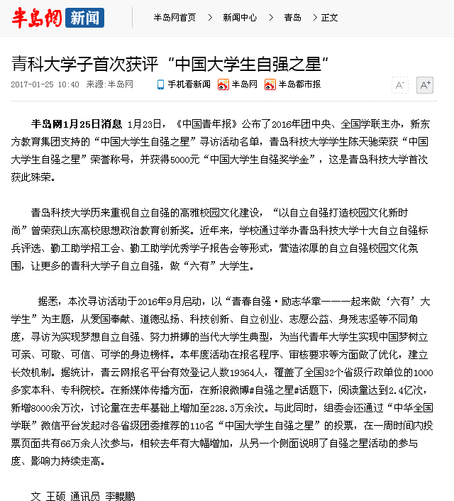【半岛网】青科大学子首次获评“中国大学生自强之星”