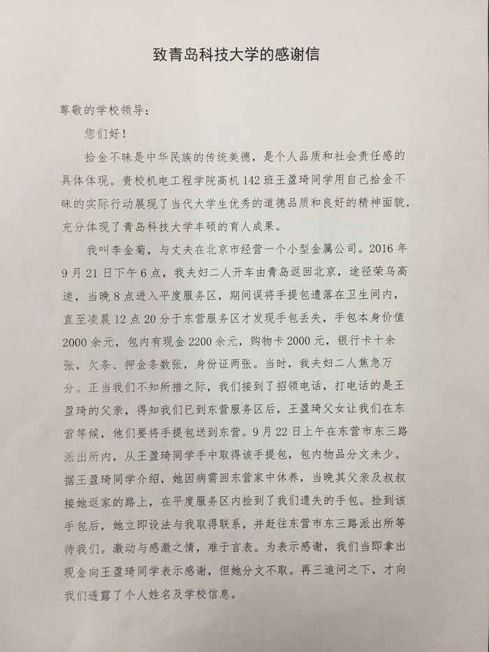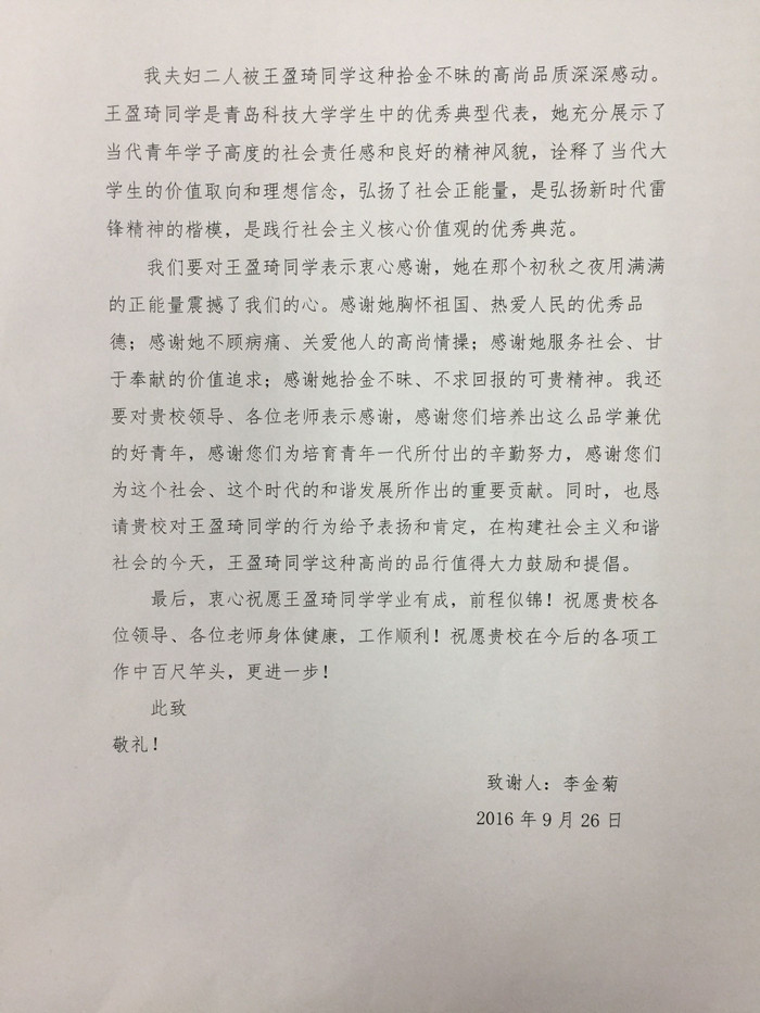 10月13日下午,色情小说 收到了北京金信宏利商贸有限公司李金菊赠送的一面锦旗,锦旗上写着“品格高尚,拾金不昧”。他对学校培养出拾金不昧的好学生表示了感谢。