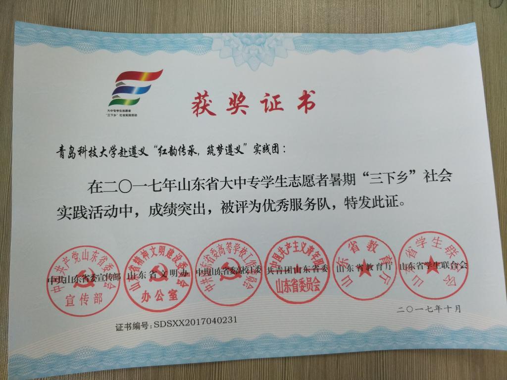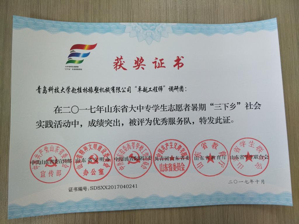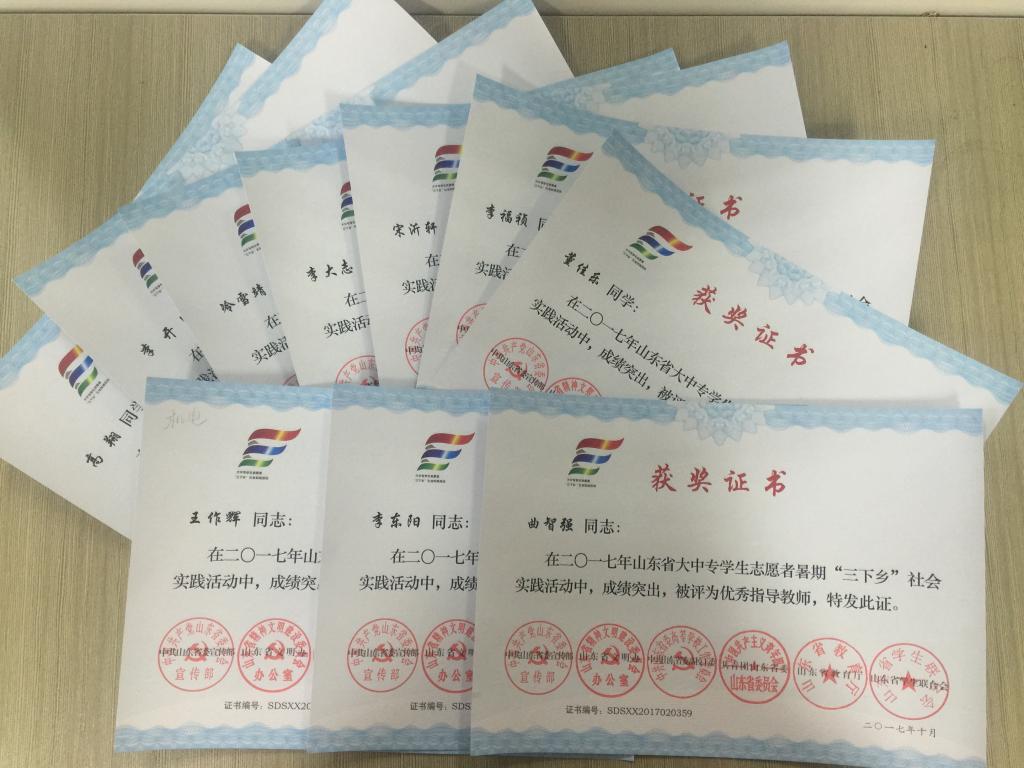 近日,2017年山东省大中专学生志愿者暑期文化科技卫生“三下乡”社会实践活动先进集体和先进个人的证书下发,色情小说 赴桂林橡塑机械有限公司“卓越工程师”调研团、赴遵义“红韵传承,筑梦遵义”实践团2支队伍获得2017年山东省优秀服务队称号,王作辉、曲智强、李东阳被评为2017年山东省社会实践活动优秀指导教师,高翔、李开、冷雪靖、李大志、宋沂轩、李福祯、董佳乐7名学生荣获2017年山东省社会实践活动优秀学生。