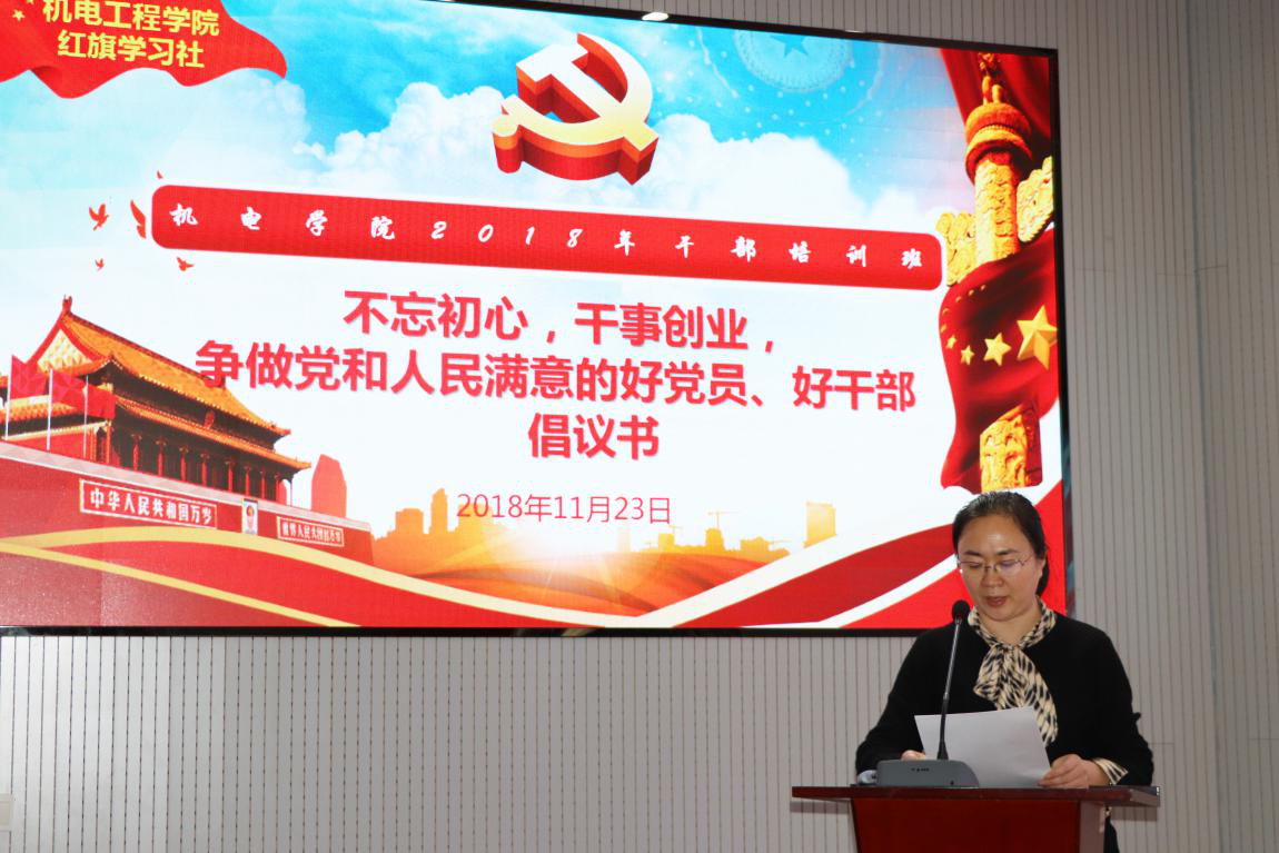何燕宣读了《不忘初心,干事创业,争做党和人民满意的好党员、好干部》倡议书,希望学员们加强思想理论武装,深入学习提高认识,将习近平总书记系列重要讲话精神转化为教书育人、立德树人的行动指南,不负党和人民重托,做对党忠诚的老实人、做人民群众的贴心人、做引领发展的开路人、做廉洁自律的干净人,号召全体学员树立思想标杆,在平凡的岗位上创造新时代更加美好的光辉业绩,为推动学校“五有”高水平大学建设作出新的更大贡献!