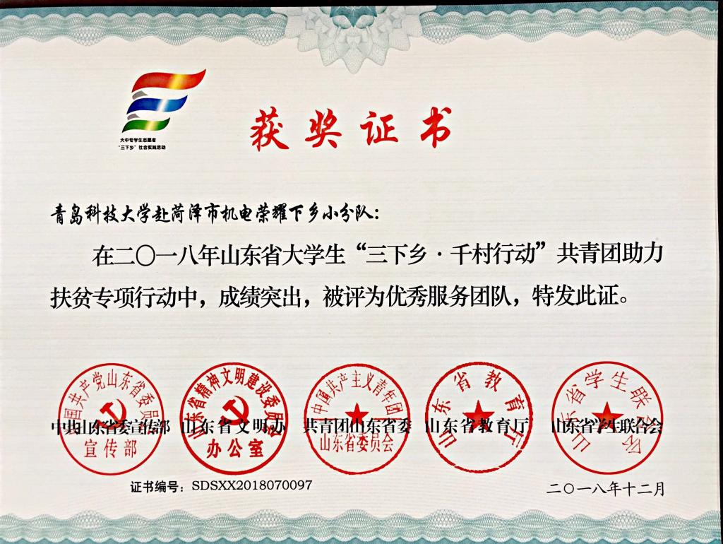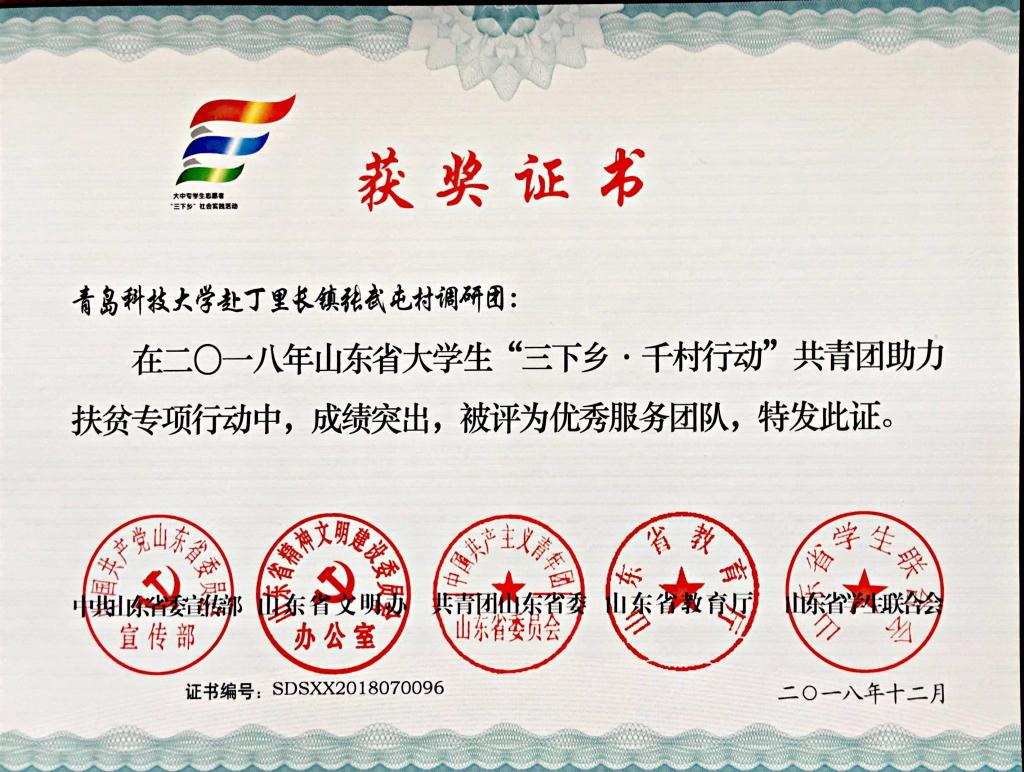 赴丁里长镇张武屯村调研团”获“三下乡·千村行动”共青团助力扶贫专项行动省级优秀服务团队,曲智强、李东阳获 “三下乡·千村行动”共青团助力扶贫专项行动社会实践活动优秀指导教师,王娟娟、苗清获“三下乡”社会实践活动优秀指导教师,毕岚森等多名学生获 “三下乡”社会实践优秀学生。