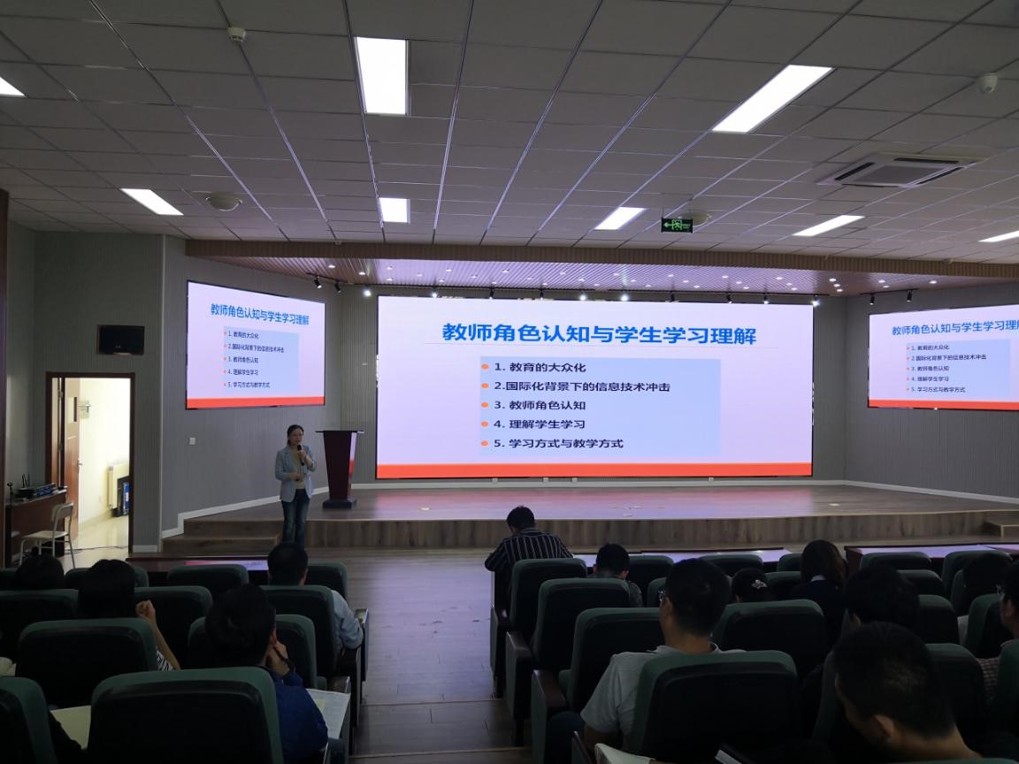 朱惠华老师以《教师角色认知与学生学习理解》为题从教育的大众化、国际化背景下的信息技术冲击、教师角色认知、理解学生学习、学习方式与教学方式等方面对大家进行了讲解;另外又从雨课堂在教学中的应用对大家进行了详细的介绍。