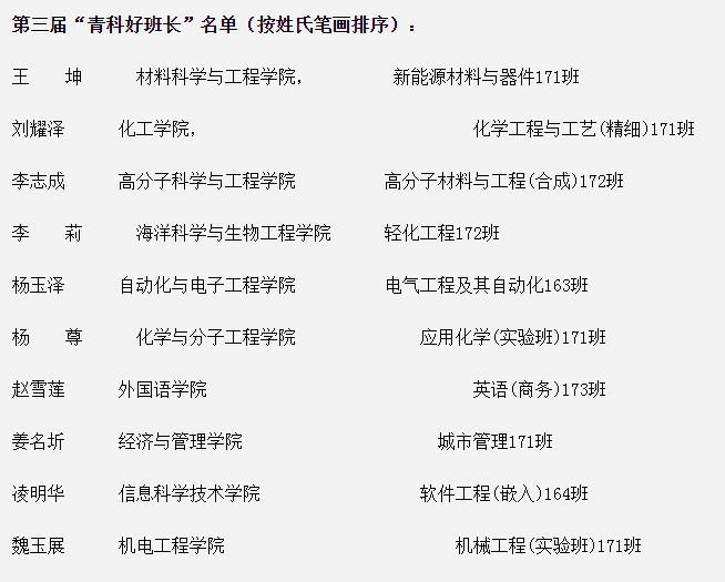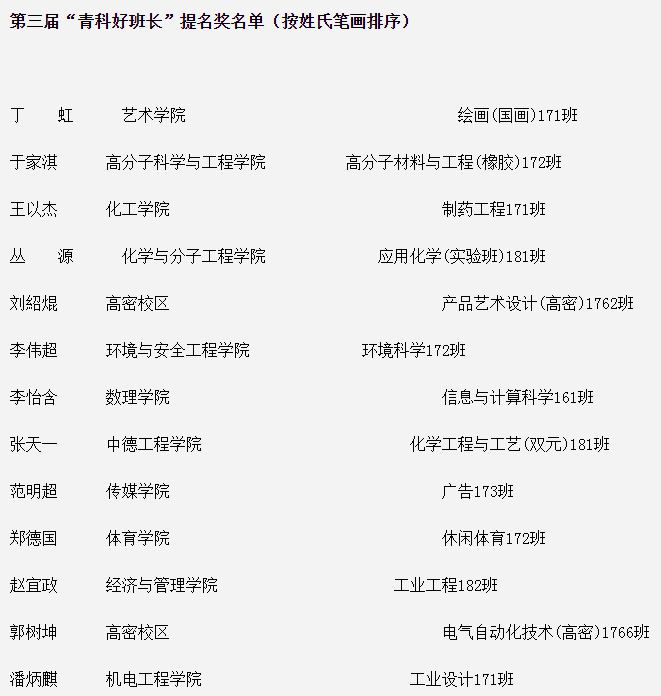 第三届“青科好班长”评选结果中,机械工程(实验班)171班魏玉展荣获第三届“青科好班长”,工业设计171班潘炳麒荣获第三届“青科好班长”提名奖。