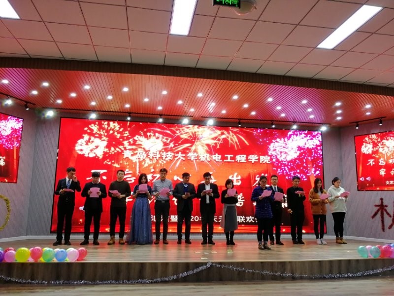 文艺汇演暨2020元旦联欢会在工业设计系师生表演的歌舞《卡路里》中拉开序幕。力学教研室的诗朗诵《七十年风雨路》歌颂了祖国70年的辉煌成就,高机系的《明天会更好》表达了机电全体老师对学校、对学院的美好祝福。何燕和郭建章两位院长的朗诵《乳娘》将联欢会推向了高潮。分团委的《中国梦》以歌曲、舞蹈、新闻主持、现场报道相互交融的新颖独特方式将分团委一年来辛勤的工作和取得成绩呈现给每位老师,引起了一阵阵热烈的掌声。王娟娟老师笛子独奏《姑苏行》,船舶系的小合唱《桥边姑娘》和《你笑起来真好看》、能动系、新能源系的歌舞《野狼disco》和《今天是你的生日》、材控系的小合唱《光阴的故事》、机自系的小合唱《我的未来不是梦》,一首首动听的乐曲,一段段优美的旋律,展现了各教研室老师的多才多艺,活力迸射的精神面貌。