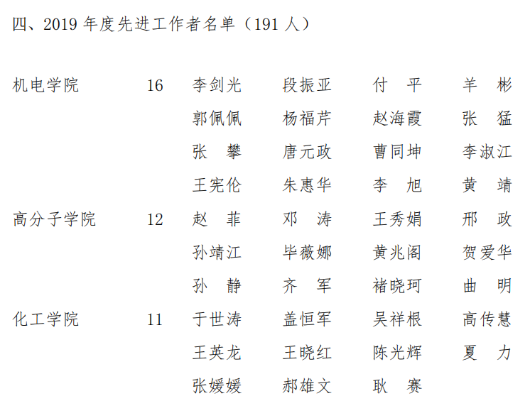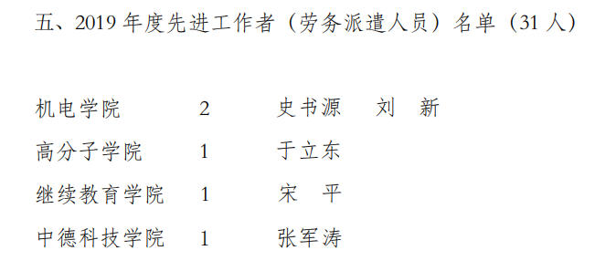 分团委(学生工作办公室)获“2019年度校级先进集体”称号,李剑光、段振亚、付平、羊彬、郭佩佩、杨福芹、赵海霞、张猛、张攀、唐元政、曹同坤、李淑江、王宪伦、朱惠华、李旭、黄靖16名老师获“先进工作者”荣誉称号,史书源、刘新获2019 年度先进工作者(劳务派遣人员)。