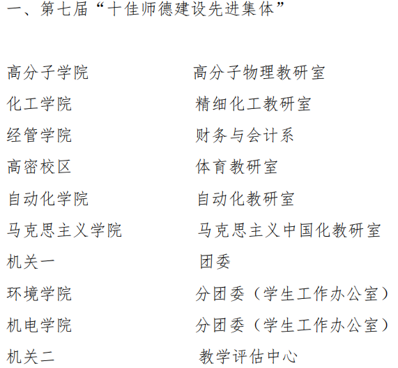 分团委(学生工作办公室)获第七届“十佳师德建设先进集体”称号,王作辉老师获第十届“十佳育人标兵”荣誉称号,过程装备与控制工程系、新能源科学与工程系、色情小说