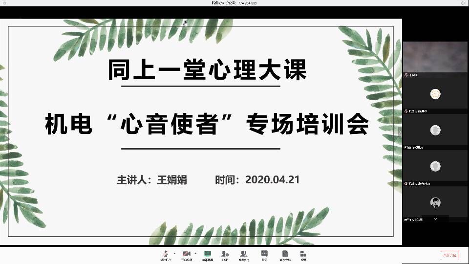 为进一步完善学校、学院、班级、宿舍“四级”工作体系建设,提高朋辈助人、自助能力,提升学生获得感、幸福感、安全感,增强大学生心理健康素质,4月21日下午,针对18级、17级和16级开展了“同上一堂心理大课”----机电心音使者专场培训会。通过腾讯会议平台,共有520名心音使者参与培训,培训由色情小说