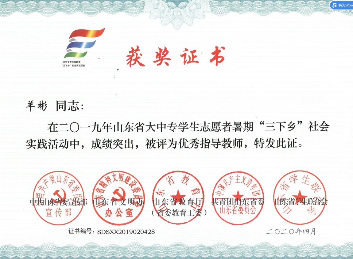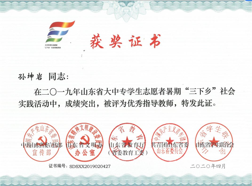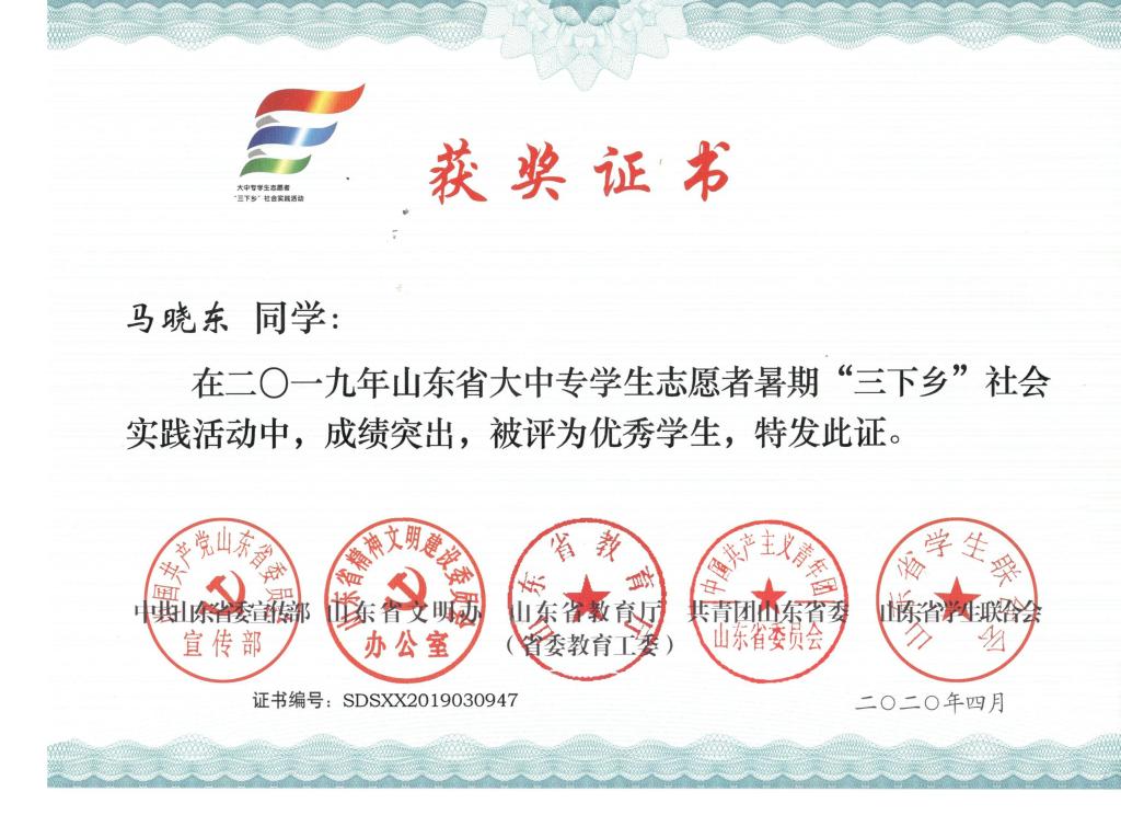 近日,2019年山东省大中专学生志愿者暑期文化科技卫生“三下乡”社会实践活动先进集体和先进个人的证书下发,色情小说 “色情小说 精准扶贫进程 美丽乡村建设成果”调研团、获“三下乡”省级优秀服务团队,孙坤岩、羊彬获“三下乡”社会实践活动优秀指导教师,籍翔宇、张晓楠、范浩然、马晓东获 “三下乡”社会实践优秀学生。