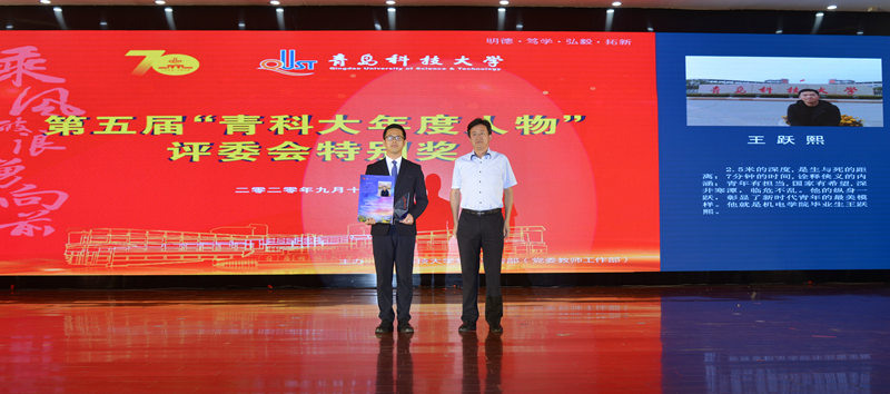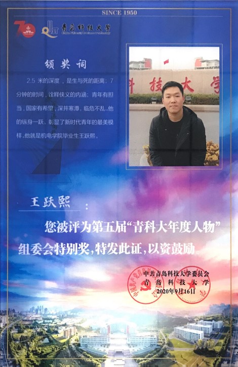 年度人物颁奖典礼于2020年9月17日于二报举行。我院校友19届校友王跃熙获评第五届“青科大年度人物”评委会特别奖。他勇救落井工人,被中央电视台等媒体广泛报道。他先后获得“崂山区见义勇为先进个人”、“山东好人之星”等荣誉,并于2019年3月入选中央宣传部、中央文明办主办的中国好人榜。青年有担当,国家有希望。他的纵身一跃,彰显了新时代青年最美的模样。校党委学生工作部、学生工作处处长王锋业为王跃熙颁奖。