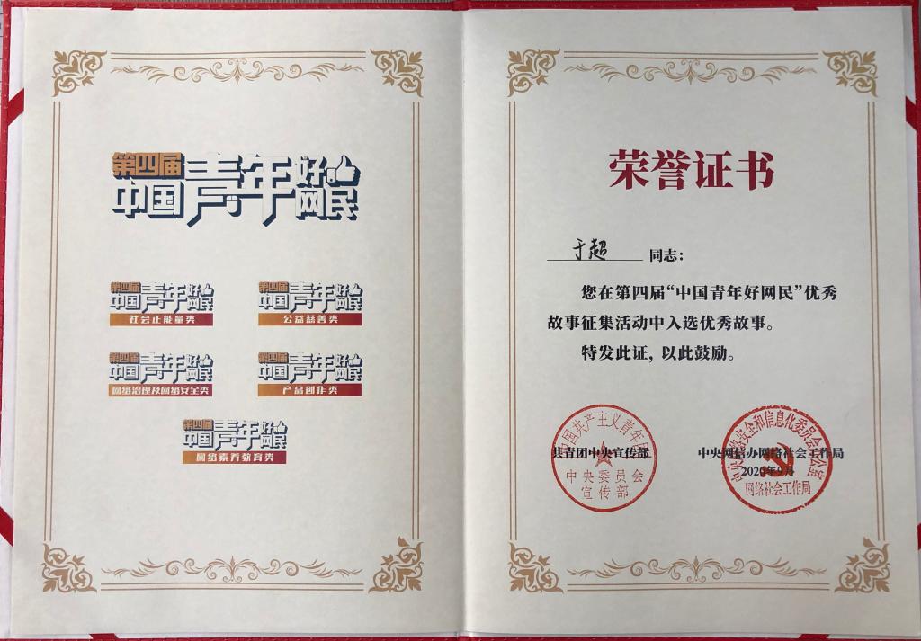 辅导员于超在共青团中央宣传部、中央网信办网络社会工作局主办的第四届“中国青年好网民”优秀故事征集活动中脱颖而出,荣获“中国青年好网民”荣誉称号。