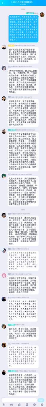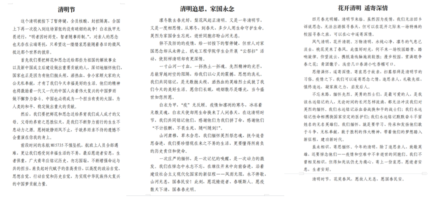 学生会开展“清明寄哀思”征文活动。组织学生们以笔寄情,与英烈对话,提高思想觉悟,坚定理想信念,汲取不畏强敌、不畏风险、敢于斗争、奋勇向前的勇气与力量。