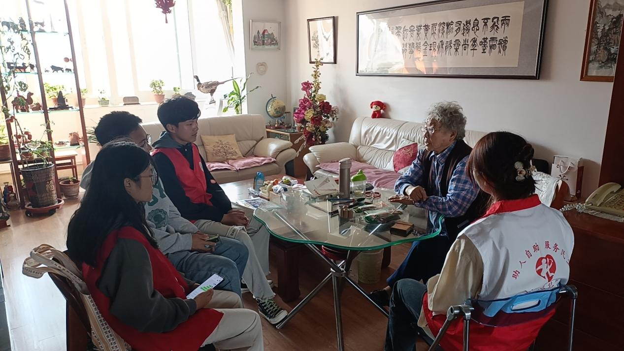 微尘志愿者协会会员与社工站工作人员分组入户,走访了以范玉芬老人为代表的病症患者和以郑文彪老先生为代表的退休老人,了解了他们的身体状况和生活情况并倾听了他们的诉求。大学生志愿者通过采访的形式与老人进行互动,提升老人的自我价值感。