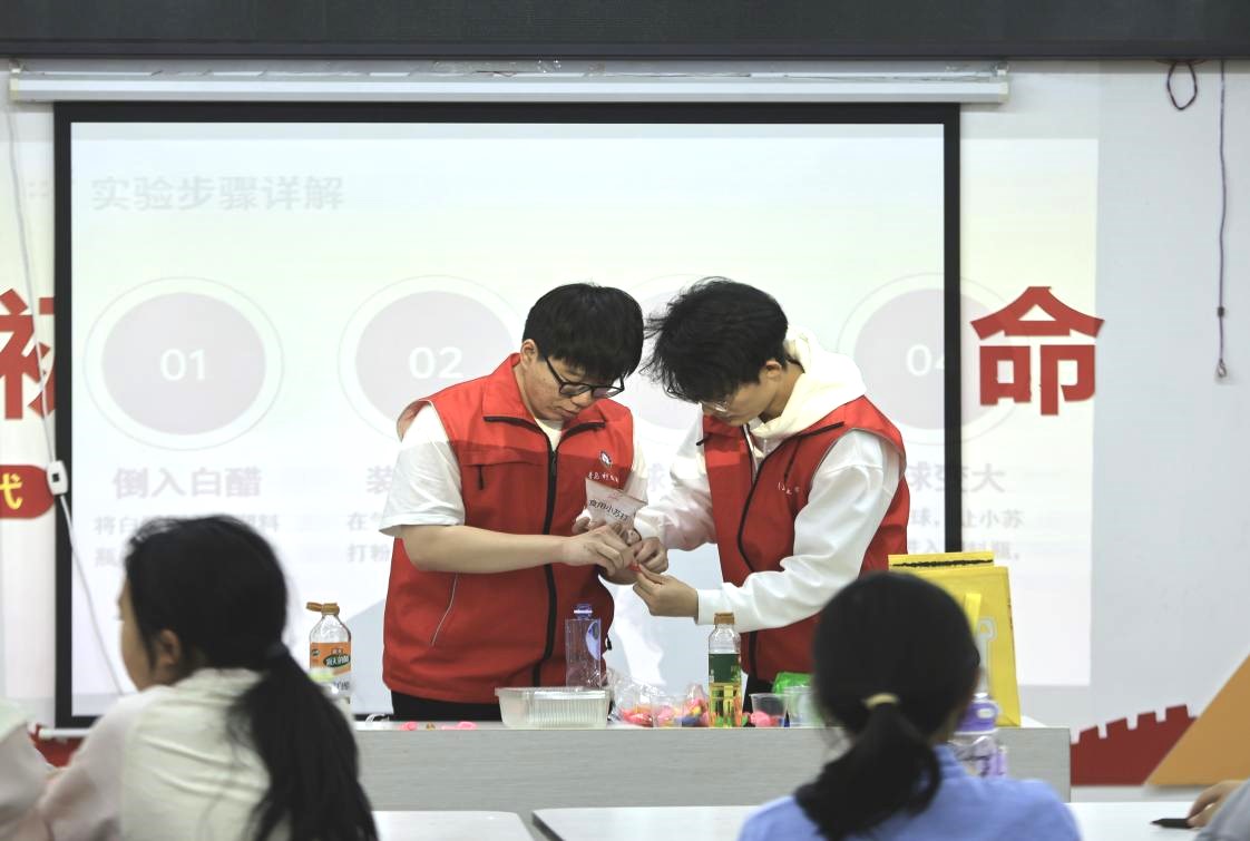 研究生会以科普和实践的方式,为小朋友们带来了一节别开生面的科普活动。此次活动以“生活中的化学—有趣的二氧化碳”为主题,通过“知识讲授+实验操作+思维融合”的创新模式,为社区儿童打造沉浸式科学体验,培养小朋友的问题发现能力和科学探究精神。