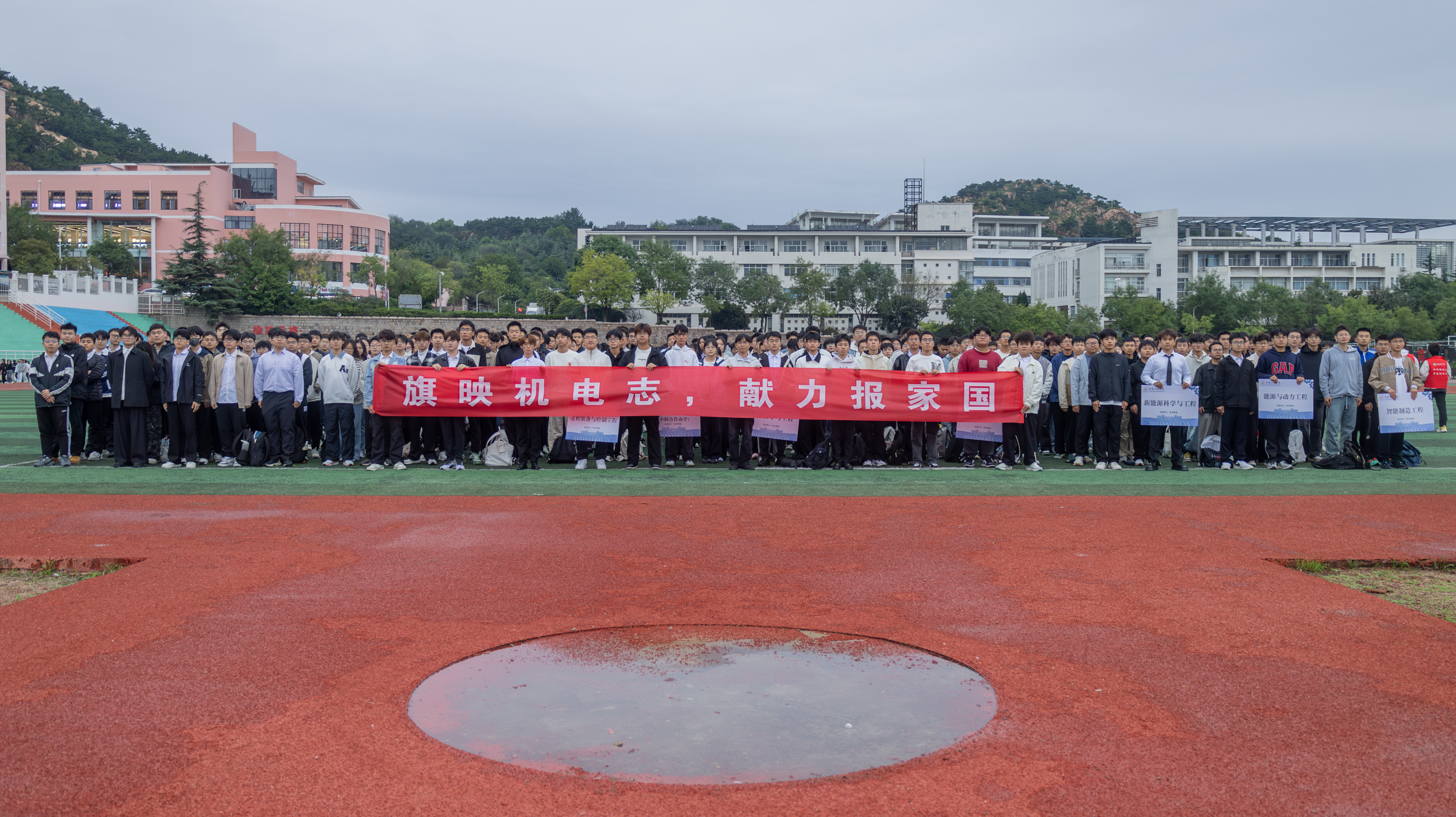 于崂山校区南苑操场开展“旗映机电志,献力报家国”升旗仪式。学院党委副书记兼副院长杨小明,学院团干部、各年级团学骨干、青年团员、学生代表近2000人齐聚操场,升旗仪式由学院团委书记逄柏鹏主持。