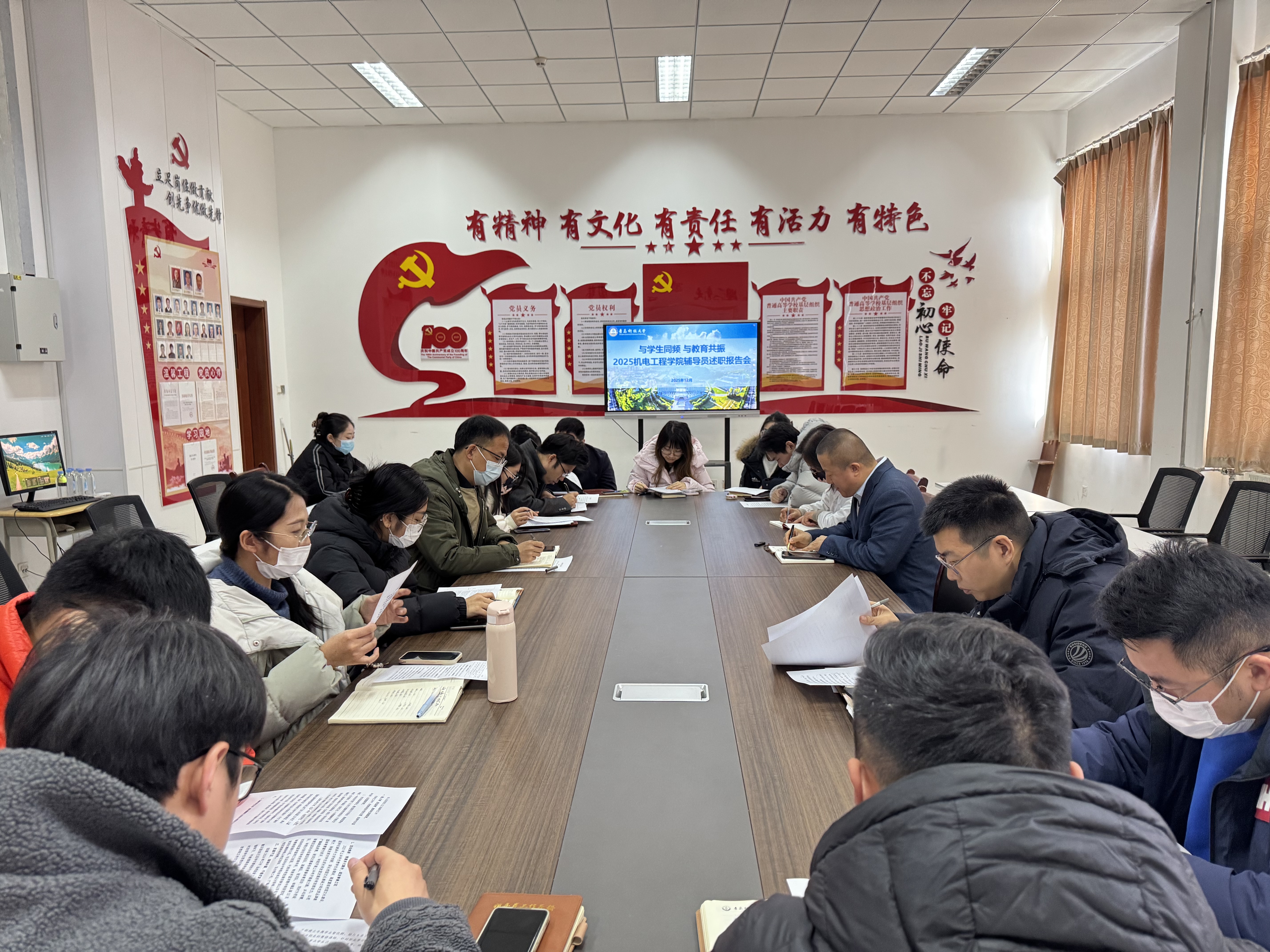在机电楼党建活动室组织2025年度专职辅导员述职报告会。学院党委副书记杨小明参加会议并讲话,副院长张卫锋、教师代表白杨、校党委宣传部理论教育科正科级干事王乐昌受邀参会,全体专兼职辅导员参加会议并依次述职。