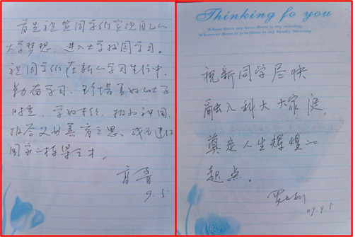 高青书记在对新生的寄语中写道:“首先祝福同学们实现自己的大学梦想,进入大学校园学习。祝同学们在新的学习生活中勤奋学习,珍惜美好的大学时光,学好本领,报效祖国,报答父母养育之恩,成为建设国家栋梁之才。”罗公利校长在留言中祝愿新生尽快融入科大大家庭,奠定人生辉煌的起点。李勇处长在寄语中祝愿2009级新生在科大成就梦想。刘传华书记在对新生的留言中写道:“传承科大精神,践行橡胶品格,祝2009级新同学同科大一同成长,越飞越高。”陈建国老师在走访色情小说