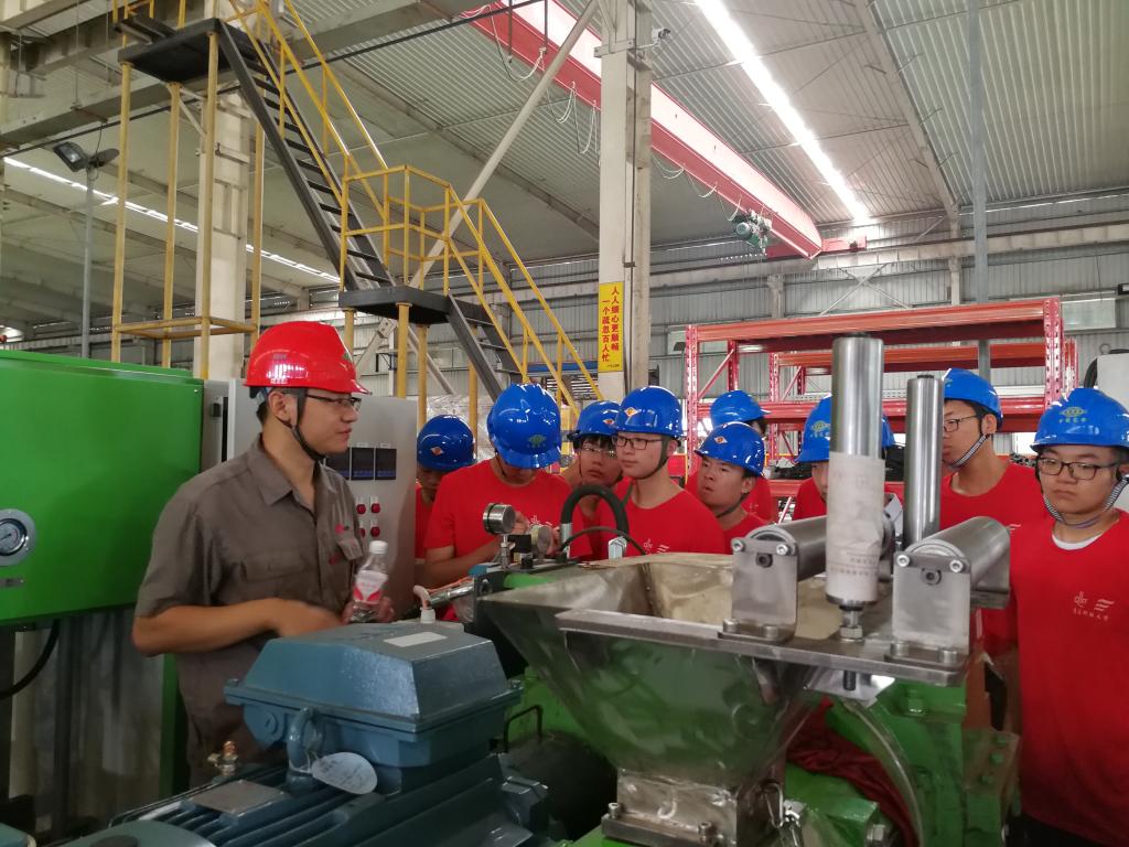 经简单休整后,实践团成员冒着酷暑,按照生产安全参观要求,在孙总的带领下深入生产制造中心的车间,实际参观学习流水线操作。在高温下的车间,实践团成员认真听取孙总的讲解,从图纸到实物,从整体到细节,孙总对挤出机进行了详细的讲解;同时,随行的高机教研室焦冬梅老师、李红艳老师也在现场一一解答着同学们提出的问题。