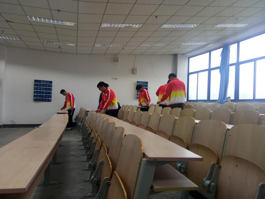 同学们准备充分,带着自备的工具-–小刀、毛巾、纸巾,相互配合展开工作。一些同学用湿毛巾仔仔细细地擦掉桌子上的笔记,还有的同学拿着小刀把桌上的贴纸刮掉,另外一些同学负责擦黑板、清理讲桌,场面十分和谐。经过半个小时的努力,大家把教室清理得干净整洁,如同刚被大雨冲刷过的校园,透着明净美丽。