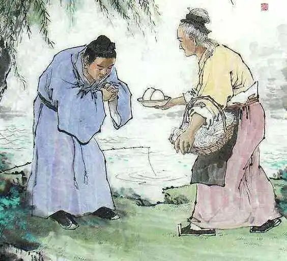 有一位为别人当佣人的老婆婆很同情他,支持他读书,还每天给他饭吃。面对老婆婆的一片诚心,韩信很感激,他对老人说: "我长大了一定要报答你。”老婆婆笑着说: "等你长大后我就入土了。”