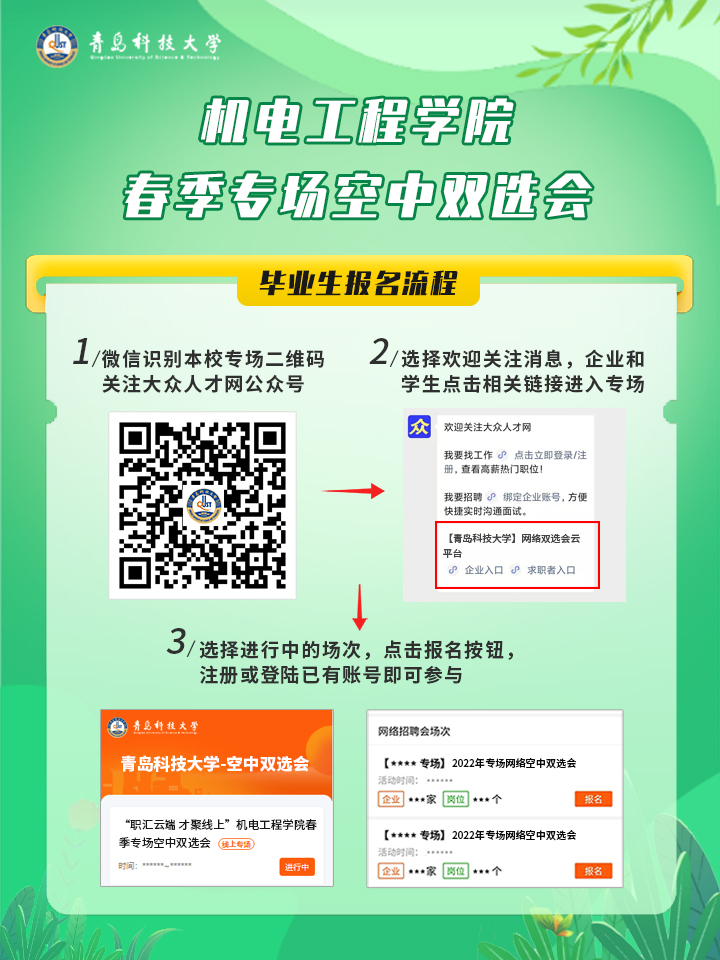 为贯彻落实党中央、国务院“稳就业”“保就业”决策部署,根据山东省人社厅和教育厅对高校毕业生就业工作的相关要求,同时为做好学校疫情防控常态化条件下校园招聘工作,学院联合大众人才网就业平台组织持续性、常态化的就业双选会系列活动,为用人单位招聘和学院应、往届毕业生稳定就业拓路护航,诚挚邀请您参会。