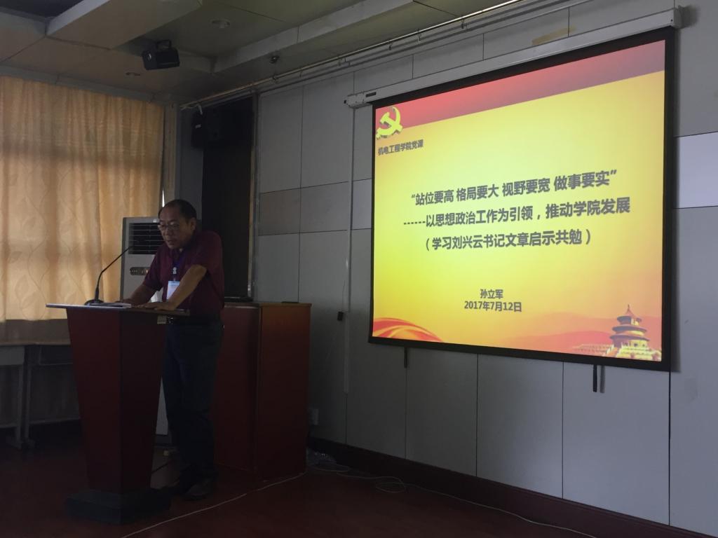7月12日,学院党总支书记孙立军结合刘书记文章精神用90分钟时间为学院机自系党支部、力学系党支部、办公室综合党支部、高机系党支部党员上了《“站位要高 格局要大 视野要宽 做事要实”------以思想政治工作为引领,推动学院健康发展(学习刘兴云书记文章启示共勉)》的党课。